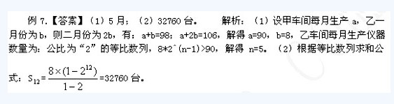 例7.甲、乙兩個(gè)車間生產(chǎn)同一種儀器,甲車間生產(chǎn)的儀器數(shù)量每個(gè)月保持不變,乙車間生產(chǎn)的儀器數(shù)量每個(gè)月增加一倍。已知一月份甲、乙兩個(gè)車間生產(chǎn)的儀器總數(shù)是98件,二月份甲、乙兩個(gè)車間生產(chǎn)的儀器總數(shù)是106件。(1)那么乙車間生產(chǎn)的儀器數(shù)量第一次超過(guò)甲車間生產(chǎn)的儀器數(shù)量是在幾月?(2)如果乙一直按照這個(gè)進(jìn)度生產(chǎn)下去,則其在這一年內(nèi)生產(chǎn)了多少臺(tái)儀器?