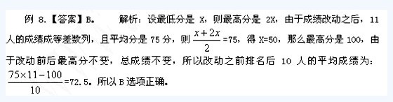 例8.某次對(duì)11名同學(xué)進(jìn)行成績(jī)排名,發(fā)現(xiàn)最高分恰好是最低分的兩倍,后來(lái)發(fā)現(xiàn)某道題判錯(cuò)了,改過(guò)后,11人的成績(jī)恰好成等差數(shù)列,且最高分最低分成績(jī)不變,總成績(jī)不變,已知改過(guò)成績(jī)之后平均分是75分,問改成績(jī)之前,排名后10人的平均分是多少?