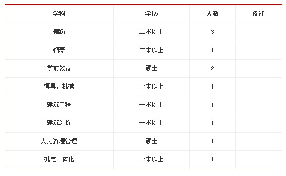 舞蹈教師3人,要求二本以上;鋼琴教師1人,要求二本以上;學(xué)前教育教師2人,要求碩士;模具、機(jī)械教師1人,要求一本以上;建筑工程教師1人,要求一本以上;建筑造價(jià)教師1人,要求一本以上;人力資源管理教師1人,要求碩士;機(jī)電一體化教師1人,要求一本以上。(見(jiàn)附表)