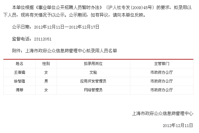 2012年上海市政府公眾信息網(wǎng)管理中心擬錄人員