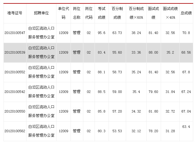 2012年貴陽白云區(qū)事業(yè)單位招聘面試成績更正通知