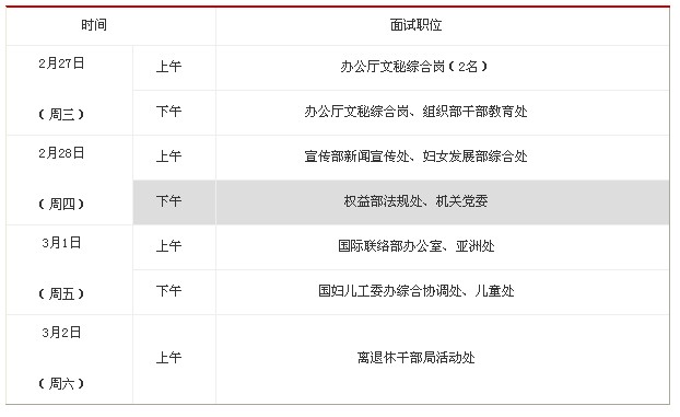 2月27日至3月2日,每天上午9:00、下午13:30準(zhǔn)時開始。各職位具體時間如下: