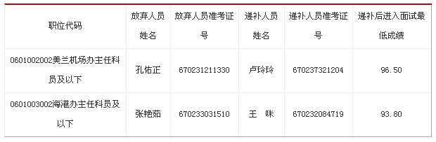 因部分進入面試考生放棄面試資格,根據(jù)有關(guān)規(guī)定,我局在報考該職位公共科目筆試成績合格的考生中,按照成績由高到低的順序進行遞補。遞補人選如下: