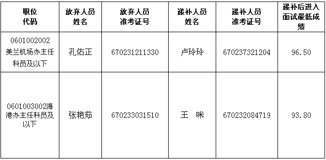 因部分進(jìn)入面試考生放棄面試資格,根據(jù)有關(guān)規(guī)定,我局在報(bào)考該職位公共科目筆試成績(jī)合格的考生中,按照成績(jī)由高到低的順序進(jìn)行遞補(bǔ)。遞補(bǔ)人選如下: