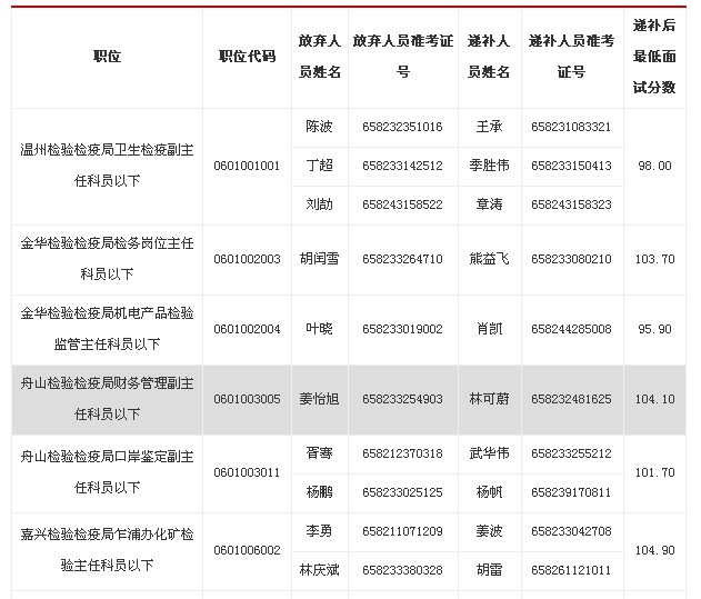 因部分進入面試人員自愿放棄面試資格,現(xiàn)根據(jù)公務(wù)員考錄有關(guān)規(guī)定進行遞補。遞補人員詳見下表: