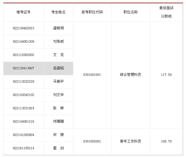 因部分考生放棄面試資格,按照公務員考試錄用工作有關規(guī)定,經(jīng)中央組織部審核,從公共科目筆試合格考生中,按筆試分數(shù)排序依次遞補以下面試人員。請遞補考生按照《共青團中央關于2013年招錄機關工作人員郵寄材料的通知》有關要求提供材料并參加面試。