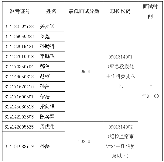 注:1.進(jìn)入應(yīng)急救援處主任科員及以下招錄崗位面試名單考生劉偉、進(jìn)入面試遞補(bǔ)考生程鵬自愿面試資格,我局按筆試綜合成績排名高低遞補(bǔ)陳奕霖進(jìn)入面試。