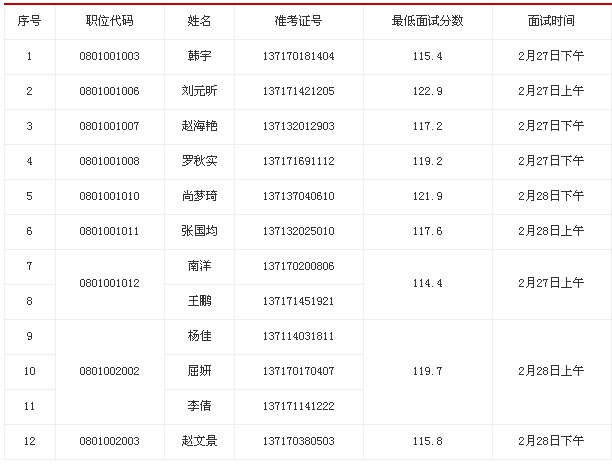因部分進(jìn)入我局面試范圍的考生自愿放棄面試資格,根據(jù)有關(guān)規(guī)定,按照公共科目筆試成績順序,遞補(bǔ)以下考生為面試人選: