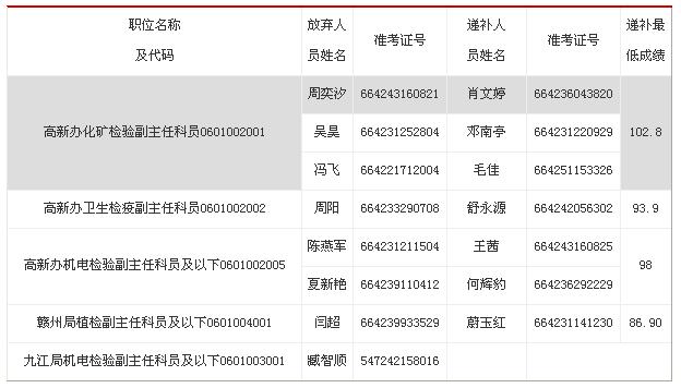 2、九江局機(jī)電檢驗(yàn)副主任科員及以下職位(0601003001)無(wú)符合遞補(bǔ)條件人員,未作遞補(bǔ)。
