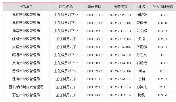 由于部分考生個人自愿放棄面試資格,根據(jù)中央機關及其直屬機構考試錄用公務員的有關規(guī)定,按公共科目筆試成績由高到低的順序,確定以下11人遞補參加2013年度云南省郵政管理局公務員招錄面試。