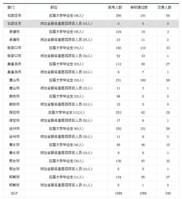2013年河北省公務(wù)員考試、2013年河北選調(diào)生考試報(bào)名已經(jīng)全面啟動(dòng),為方便考生查詢相應(yīng)職位的報(bào)名情況,以下是本次報(bào)名的統(tǒng)計(jì)結(jié)果!