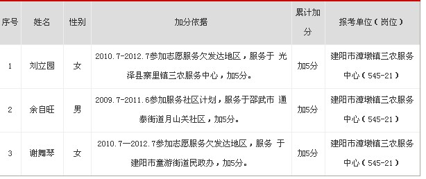 2013年建陽市事業(yè)單位招聘筆試成績加分情況公示