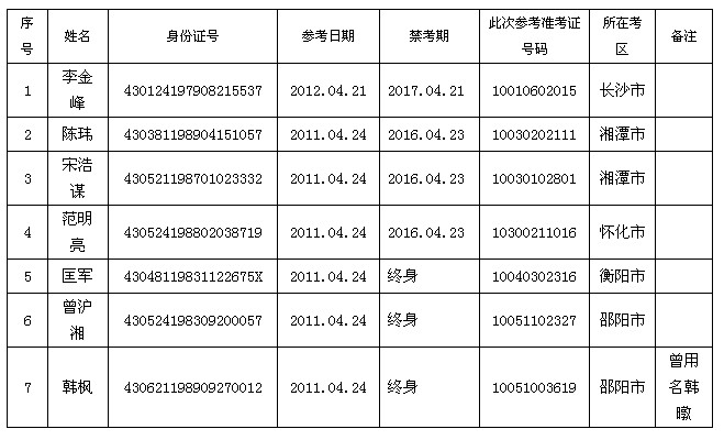 根據(jù)中華人民共和國人力資源和社會保障部令第4號《公務(wù)員錄用考試違紀(jì)違規(guī)行為處理辦法(試行)》,經(jīng)我院復(fù)核,李金峰等7名考生(名單見附表)在2011、2012年湖南省公務(wù)員考試中違紀(jì),處于禁考期,取消此次公務(wù)員考試參考資格,特予公告。