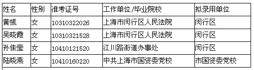 根據(jù)有關規(guī)定,經(jīng)過筆試、面試、體檢、考察等程序,現(xiàn)對擬錄用人員進行公示(名單附后)。公示期間,如對擬錄用人選有異議或有其他問題,請及時向上海市公務員局反映,舉報者要署實名,實事求是地反映舉報情況。