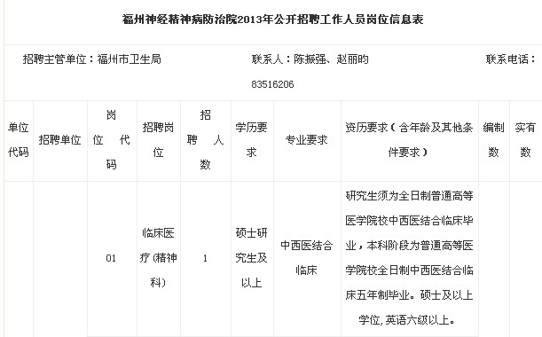 2013年福州市精神病院招聘公告