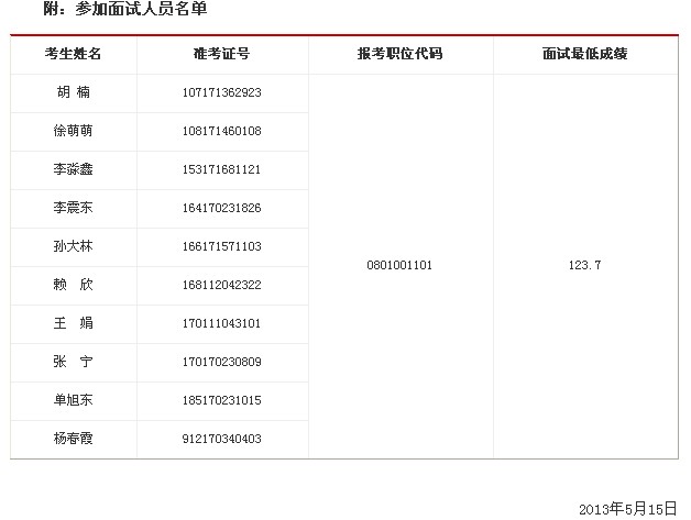 面試時間為2013年5月30日上午9:00,考生應(yīng)于5月30日上午8:00前進(jìn)入候考室,截止上午8:50仍未進(jìn)入候考室的取消面試資格。