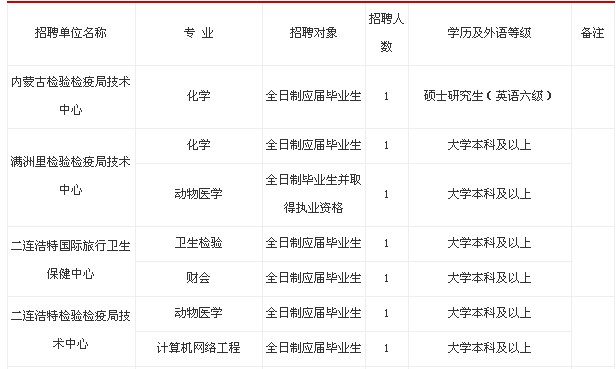 中華人民共和國內(nèi)蒙古出入境檢驗檢疫局為國家質(zhì)量監(jiān)督檢驗檢疫總局設(shè)在內(nèi)蒙古的直屬機構(gòu),下設(shè)14個分支局、2個辦事處。設(shè)有12個事業(yè)單位,分布在內(nèi)蒙古局機關(guān)、滿洲里、二連浩特、包頭和赤峰檢驗檢疫局。事業(yè)單位主要承擔(dān)實驗室檢驗檢疫技術(shù)工作、研究咨詢及檢疫風(fēng)險分析、傳染病監(jiān)測體檢、國際旅行預(yù)防接種、技術(shù)開發(fā)服務(wù)、機關(guān)后勤服務(wù)等職能。根據(jù)事業(yè)發(fā)展需要,2013年擬招聘事業(yè)單位工作人員11名。招錄計劃如下: