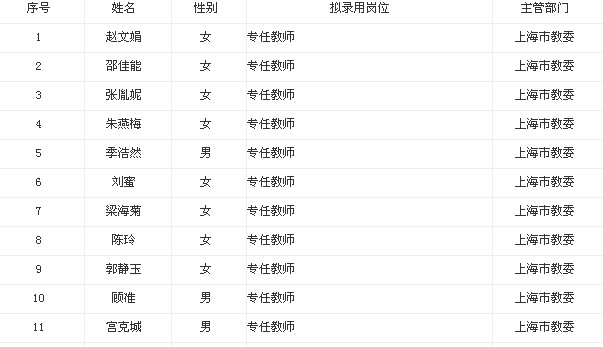 我單位根據(jù)《上海市事業(yè)單位公開招聘人員暫行辦法》【滬人社專發(fā)(2009)45號(hào)】的要求,擬錄用如下教師,現(xiàn)將有關(guān)情況予以公示。公示期間,如有異議,請(qǐng)向我單位反映。