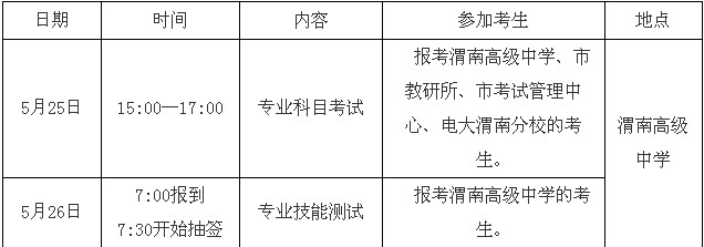 請(qǐng)參加專業(yè)技能測(cè)試的考生5月26日早7:00前到渭南高級(jí)中學(xué)明德樓4樓候考室報(bào)到,遲到30分鐘考生取消技能測(cè)試資格。