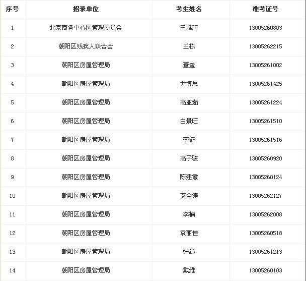 2013年朝陽(yáng)區(qū)上半年部分事業(yè)單位考試錄用工作人員擬錄用人員名單: