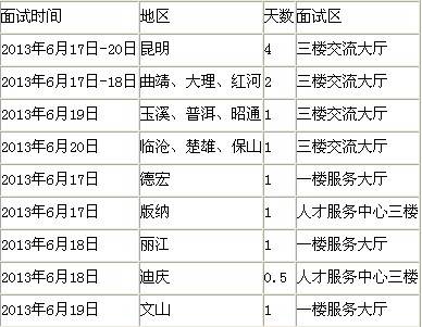 (一) 面試時間:面試時間定于2013年6月17日-2013年6月20日,上午9:00-12:00下午13:00-17:30。云南人才市場將按面試名單提前電話通知考生,請考生保持聯(lián)系電話的暢通。參加面試的考生應在規(guī)定時間到規(guī)定地點進行簽到及面試,逾期未到者,視同放棄參加面試資格。各地區(qū)面試時間安排如下: