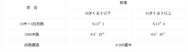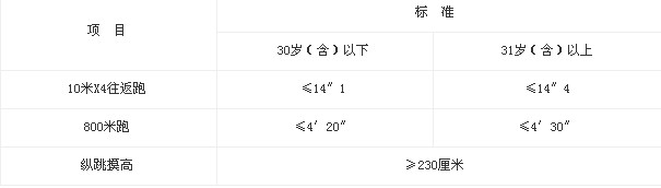 資格復(fù)審合格者全部參加體能測評。體能測評分男子組和女子組,各測評3個項目,男子組測10米×4往返跑、1000米跑和縱跳摸高;女子組測10米×4往返跑、800米跑和縱跳摸高。其中一項不達標(biāo)者予以淘汰。具體項目和標(biāo)準(zhǔn)如下: