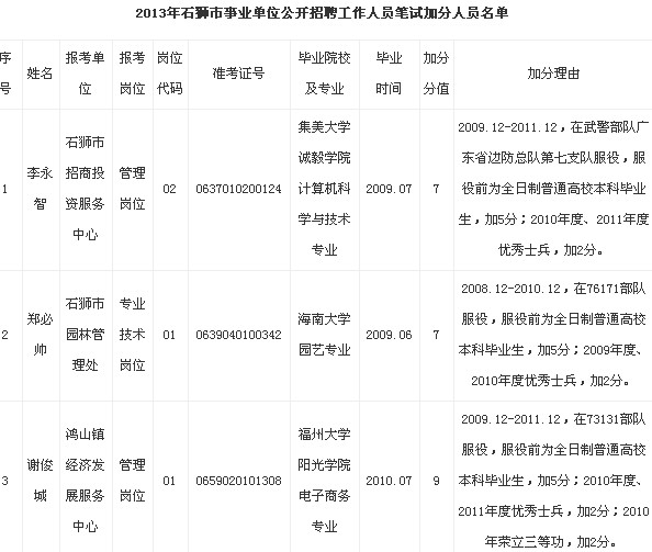 2013年石獅市事業(yè)單位招聘筆試加分名單補(bǔ)充公示