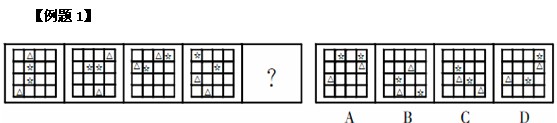 解析:首先整體來(lái)看題干所給出的圖形的組成元素及其個(gè)數(shù),都是由2個(gè)星星和2個(gè)三角形分布在4×4的方格中構(gòu)成的,圖形的構(gòu)成元素相同、元素的個(gè)數(shù)也相同,圖形表現(xiàn)出的唯一不同是這些小圖形在方格內(nèi)的位置不同。