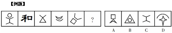 解析:題干共五個(gè)圖形,其中第二個(gè)圖形是一個(gè)漢字,其他圖形均為規(guī)則的線條類圖形。顯然,第二個(gè)圖形是特殊的,從它入手。出現(xiàn)漢字且不全為漢字,首先考慮封閉區(qū)域數(shù),很顯然題干圖形有且只有一個(gè)封閉區(qū)域,選項(xiàng)中只有D符合,故答案為D。