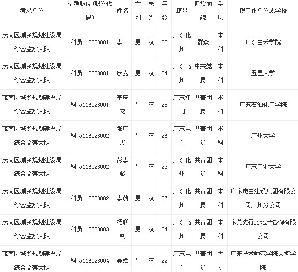 茂南區(qū)城鄉(xiāng)規(guī)劃建設(shè)局綜合監(jiān)察大隊2013年擬錄用公務(wù)員名單