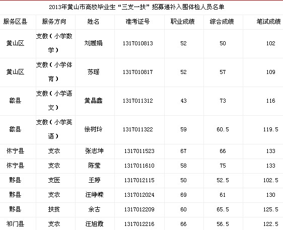 根據(jù)《2013年黃山市高校畢業(yè)生“三支一扶”招募公告》規(guī)定,因出現(xiàn)考生體檢不合格和個人放棄的情況,現(xiàn)將遞補(bǔ)體檢工作有關(guān)事項通知如下: