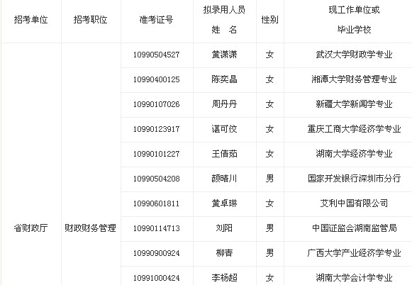 摘要 2013年湖南省財政廳擬錄用公務員名單公示