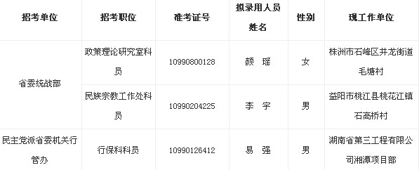 根據(jù)省委組織部、省人力資源和社會保障廳、省公務(wù)員局《湖南省2013年考試錄用公務(wù)員公告》的有關(guān)規(guī)定,經(jīng)報名、資格審查、筆試、面試、體檢、考察等程序,確定2013年省委統(tǒng)戰(zhàn)部、民主黨派省委機(jī)關(guān)行管辦考試錄用公務(wù)員擬錄用人員名單: