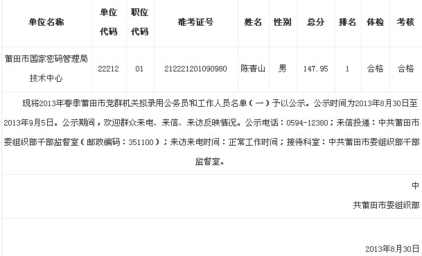 摘要 2013年福建莆田市黨群機關擬錄用公務員名單公示(一)