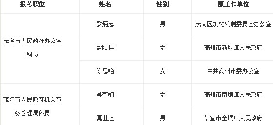 2013年廣東茂名市政府辦公室遴選公務(wù)員名單公示