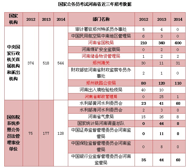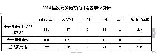 2014年國家公務員考試河南省招錄人數(shù)為672人,較2013年的695人稍有減少。通過對近三年河南省職位的統(tǒng)計與分析,國家公務員考試河南省近三年招考數(shù)據(jù)如下表所示: