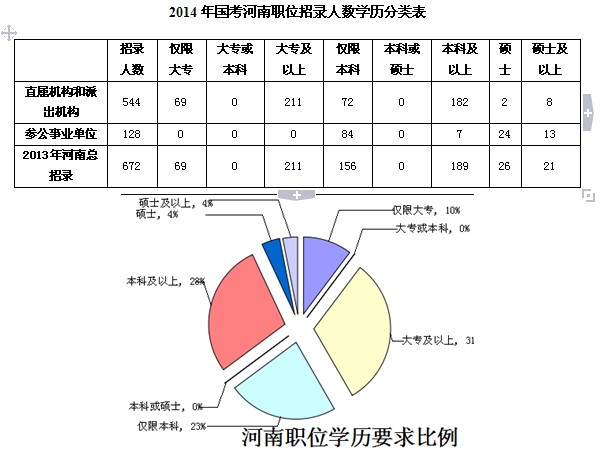 對于參加2014年國家公務員考試的廣大河南考生而言,不同學歷考生的可選擇的報考職位情況如下表所示: