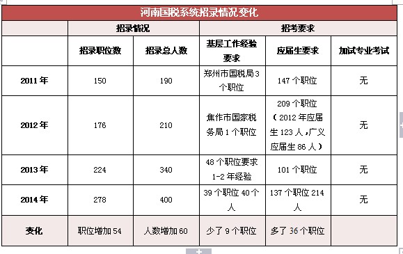 2014年國家公務員考試河南省招考職位當中,國稅系統(tǒng)職位占據(jù)了很大比例,依然是廣大河南考生選擇較多的熱門崗位。在本年度國家公務員招考中,河南省國稅系統(tǒng)招考職位及報考要求呈現(xiàn)出一些變化,如下圖所示: