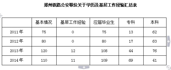 2014年國家公務員考試河南省鐵路公安系統(tǒng)招錄人數(shù)較2013年有小幅減少,減少比例為8.33%,招考條件當中學歷要求:2014年只分為本科(只限本科)、大專(僅限大專)兩個層次。其他招考條件中,2014年鐵路公安系統(tǒng)有4個職位共計11人需要兩年工作經驗,基本與2013年持平。