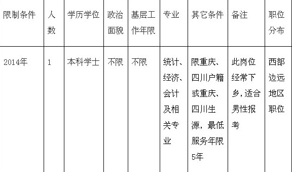 2014年與2013年相比,其限制條件明顯增多,首先專業(yè)、戶籍和最低服務年限上都有了比較嚴格的限制,其次今年招錄部門對此職位通過“備注”和“職位分布”的方式進行了更進一步解釋:“此崗位經常下鄉(xiāng),適合男性報考”和“西部邊遠地區(qū)職位”。
