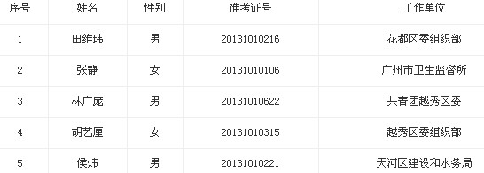 根據(jù)《中共廣州市委組織部2013年度公開選調(diào)公務(wù)員公告》要求,經(jīng)公開報(bào)名、資格審核、筆試、面試、體檢和考察,確定田維瑋、張靜、林廣龐、侯煒、胡藝?yán)宓?名同志為擬選調(diào)人選,現(xiàn)予公示。