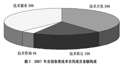 2007年全國共簽訂技術(shù)開發(fā)合同73320項(xiàng),成交金額876億元,分別比上年增長了13.5%和22.2%;共簽訂技術(shù)轉(zhuǎn)讓合同11474項(xiàng),成交金額420億元,成交金額同比增長30.8%;技術(shù)服務(wù)和技術(shù)咨詢合同成交金額分別為840億元和90億元,分別比上年增長了20.9%和5.9%。