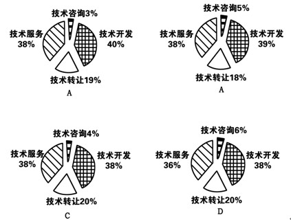 3.下列關(guān)于2006年技術(shù)開發(fā)、技術(shù)轉(zhuǎn)讓、技術(shù)咨詢和技術(shù)服務(wù)等四類合同占全國成交金額比重的圖形,描述正確的是:( )