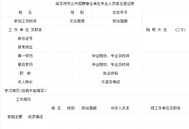 2、報(bào)名方式: 采取現(xiàn)場(chǎng)報(bào)名方式。在市政府門戶網(wǎng)站、今日綏芬河報(bào)、市人力資源和社會(huì)保障局網(wǎng)站公布詳細(xì)招聘信息。報(bào)考者需下載并填寫《綏芬河市公開招聘事業(yè)單位專業(yè)人員報(bào)名登記表》一份。