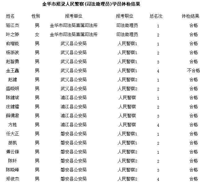 2013年浙江金華市人民警察(司法助理員)體檢結(jié)果公告
