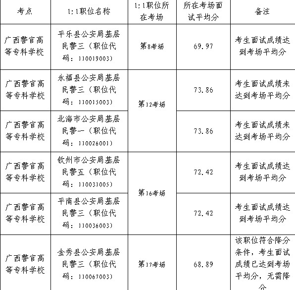 根據(jù)廣西壯族自治區(qū)2013年度政法干警招錄培養(yǎng)體制改革試點招考公告中“報考計劃錄取人數(shù)與實際面試人數(shù)比例為1:1職位的人員,其面試成績要達到當天所在考官組面試的所有人員的平均分以上(含平均分)且不得低于60分,方為合格。經(jīng)自治區(qū)公務(wù)員主管部門批準,報考少數(shù)民族艱苦邊遠地區(qū)和緊缺職位的人員,其面試合格分數(shù)線可在考場平均分的基礎(chǔ)上降低5分,但不得低于60分?!钡囊?guī)定,現(xiàn)將2013年公安系統(tǒng)招錄培養(yǎng)體制改革試點報考計劃錄用人數(shù)與面試人選的比例在1:1以下(含1:1)職位所在考場面試平均分公布如下: