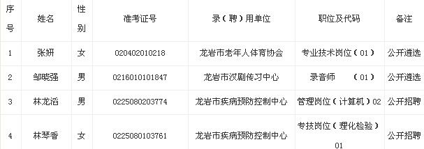 龍巖市2013年市直政府系統(tǒng)機(jī)關(guān)事業(yè)單位公開(kāi)遴選招聘工作人員擬錄(聘)用人員名單