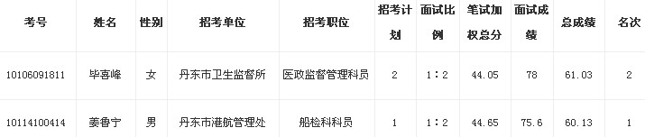 2013年丹東市各級機關(guān)和參照公務(wù)員法管理單位考試錄用公務(wù)員(工作人員)體檢、考察工作已經(jīng)結(jié)束,現(xiàn)對第四批體檢、考察合格擬錄用人員予以公示,公示期為7天。