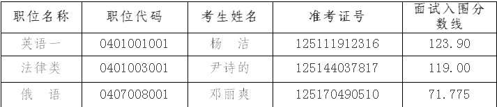 因又有部分考生放棄面試資格,根據(jù)公務(wù)員招考有關(guān)規(guī)定,擬在公共科目筆試合格的考生中,按照筆試成績(jī)從高到低的順序,遞補(bǔ)以下考生為面試人選:
