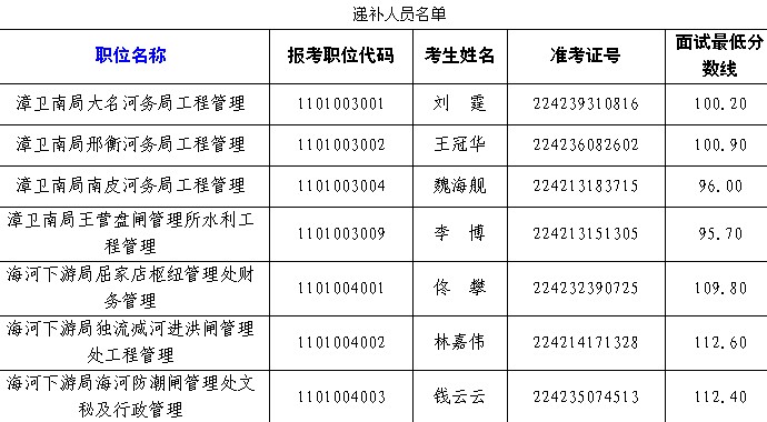 因部分考生自愿放棄面試資格,根據(jù)公務(wù)員考試錄用工作有關(guān)規(guī)定,在公共科目筆試合格考生中按照筆試成績從高到低遞補進(jìn)行遞補,請遞補人員按照《水利部海河水利委員會2014年考試錄用公務(wù)員面試公告》相關(guān)要求做好面試準(zhǔn)備工作。